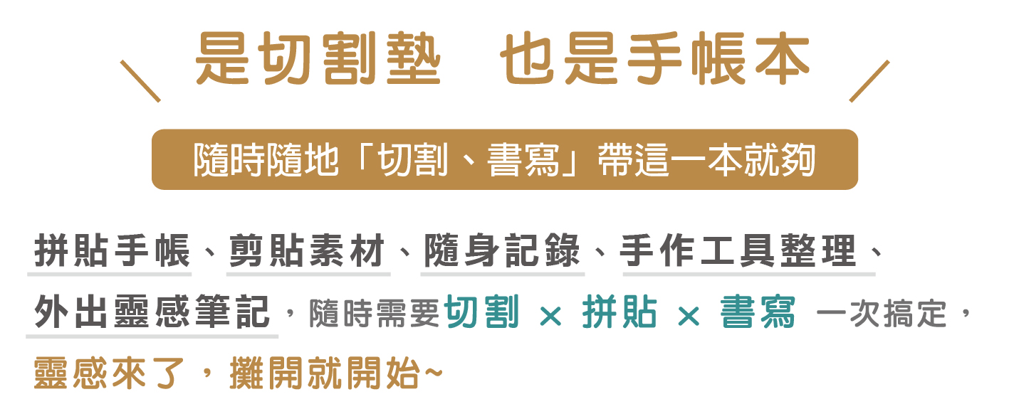拼貼手帳、剪貼素材、隨身紀錄、手作工具整理、外出靈感筆記,隨時需要 切割 x 拼貼 x 書寫 一次搞定,靈感來了,攤開就開始~