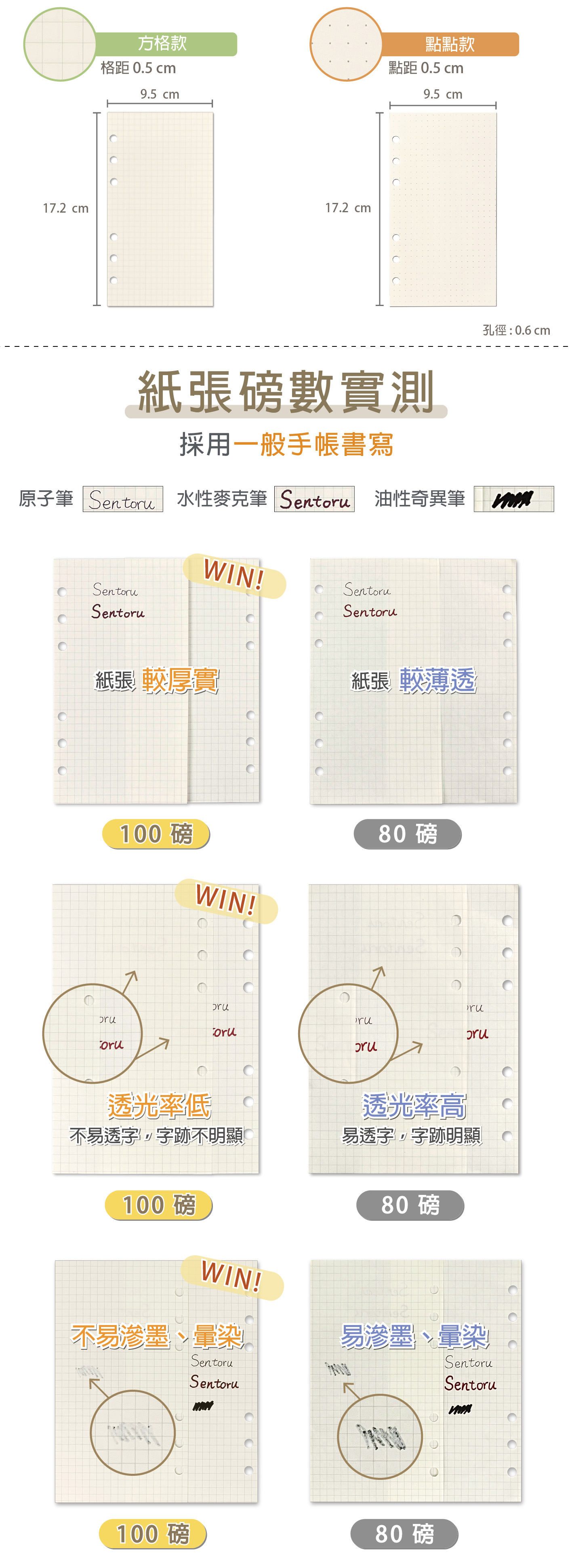 採用100磅道林紙,比一般印表機紙70~80磅厚,淺米色紙張溫和護眼,適合一般筆記及手帳書寫~