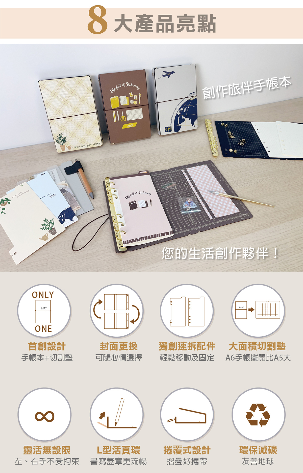 (3) 單一產品多功能使用,可以是手帳本、可以是切割墊、可以是收納工具。加上單獨零件皆可更換,達到多功能利用、永續使用的理念。