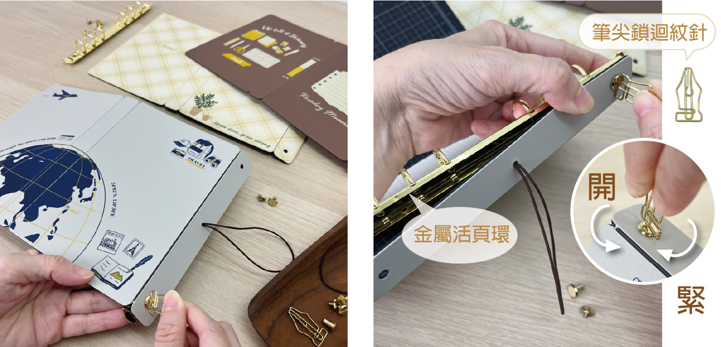 創作旅伴手帳本的書封,可自由穿搭。搭配可拆式金屬活頁環,輕鬆組裝及更換,讓您每一天都有不同的塔配 。 ( 開鎖工具 : 附筆尖鎖迴紋針 )