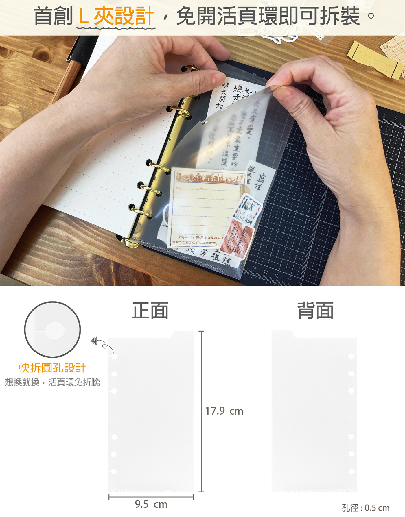 首創快拆圓孔 L 夾,Bible Size 6孔,隨手收納素材,再也不用拆活頁環。