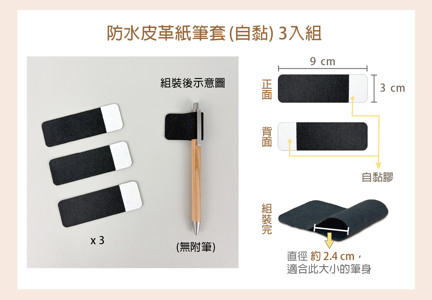 2. 皮革紙製自黏筆套,請勿放置於潮溼環境,可能造成受潮異變,自黏處脫膠。