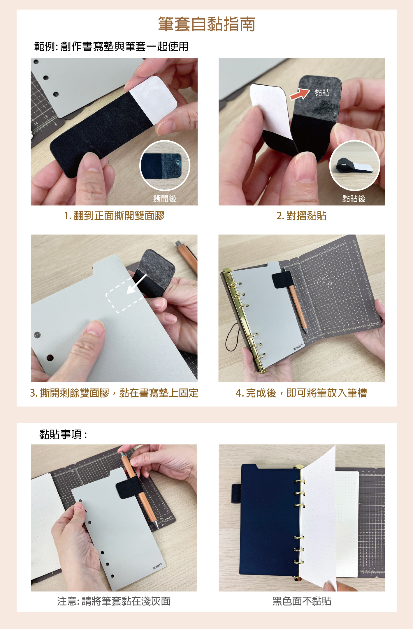 3. 撕開剩下雙面膠,黏在書寫墊上固定 (注意: 請將筆套黏在淺灰面、黑色面不黏貼)