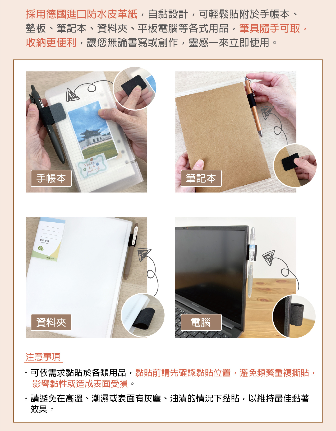 採用德國進口防水皮革紙,自黏設計,可輕鬆貼附於墊板、筆記本、資料夾、平板電腦等各式用品,筆具隨手可取,收納更便利,讓您無論書寫或創作,靈感一來立即使用 !
