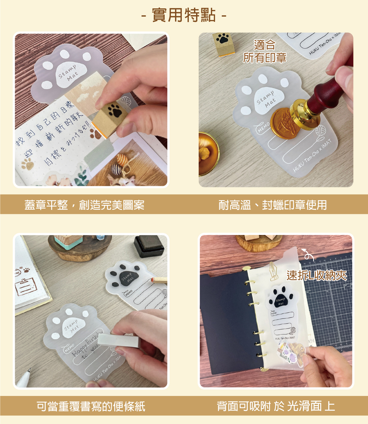 專為「手帳集章」設計,蓋章 x 封蠟 x 便利貼 一次滿足,矽膠材質 可重複擦寫,還 可吸附 在光滑面的手帳本或書套上,隨行便利好攜帶!