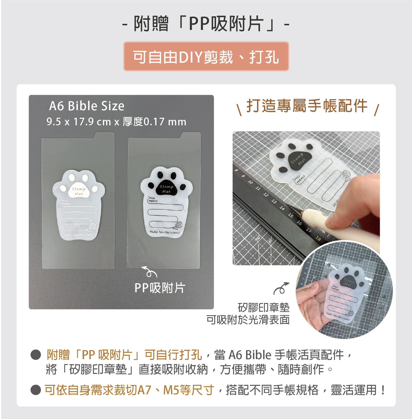 ● 可自行打孔,當 A6 Bible 手帳活頁配件,將「矽膠印章墊」直接吸附收納,方便攜帶、隨時創作。
