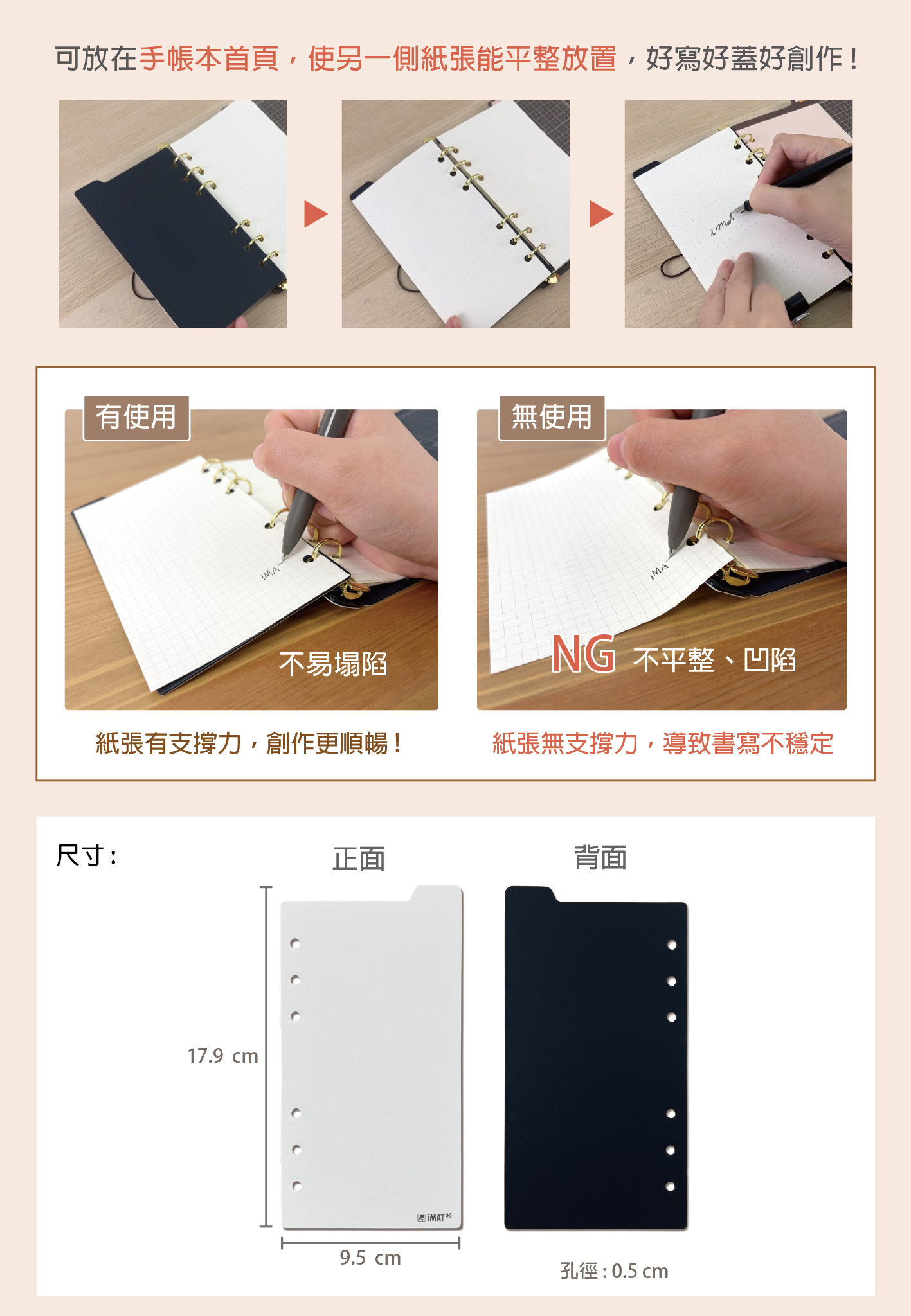 可放在手帳本首頁,使另一側紙張能平整放置,好寫好蓋好創作 !