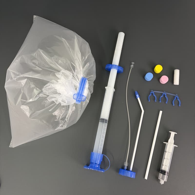 使用配件:(D)集氣袋、(M)固定夾