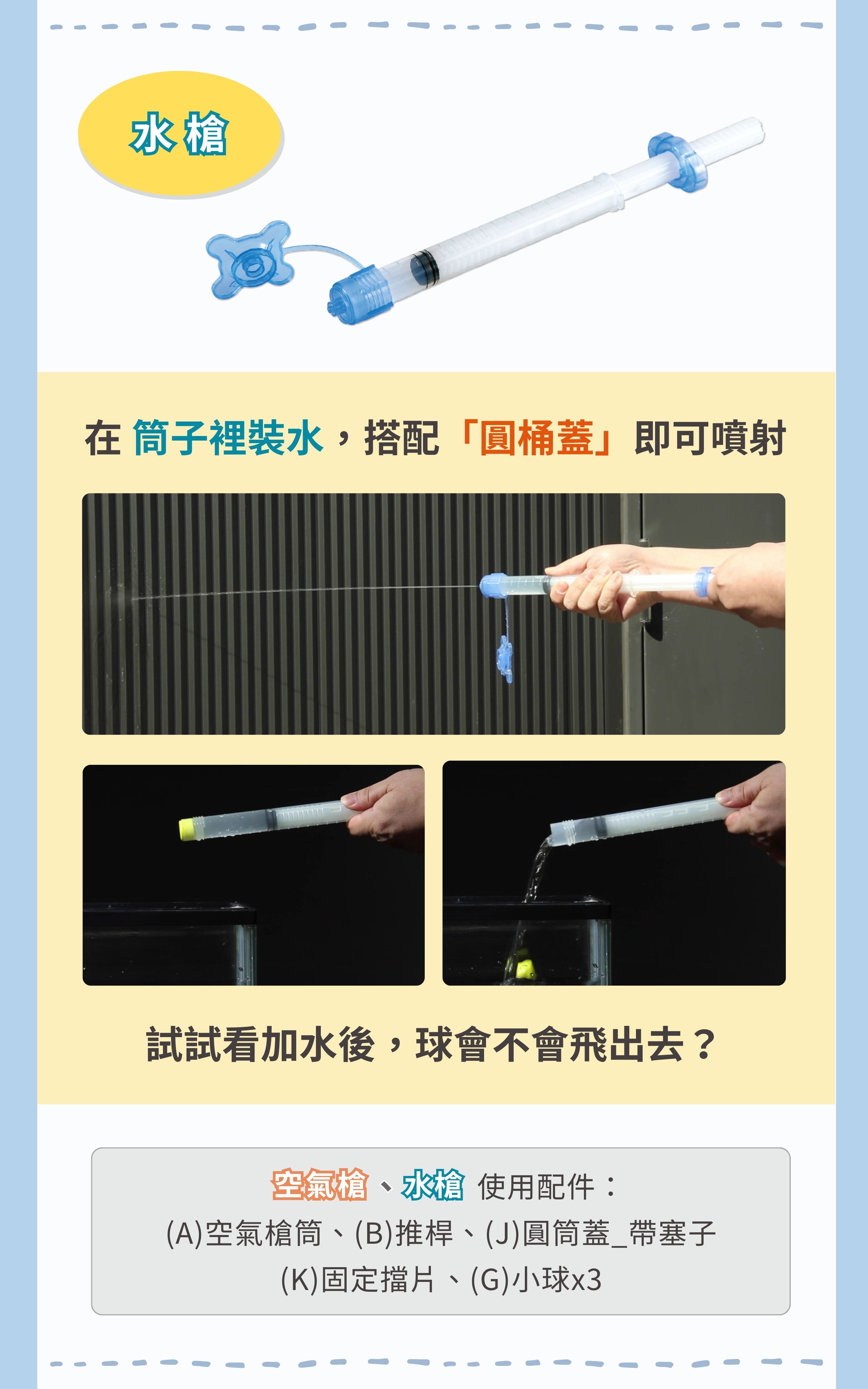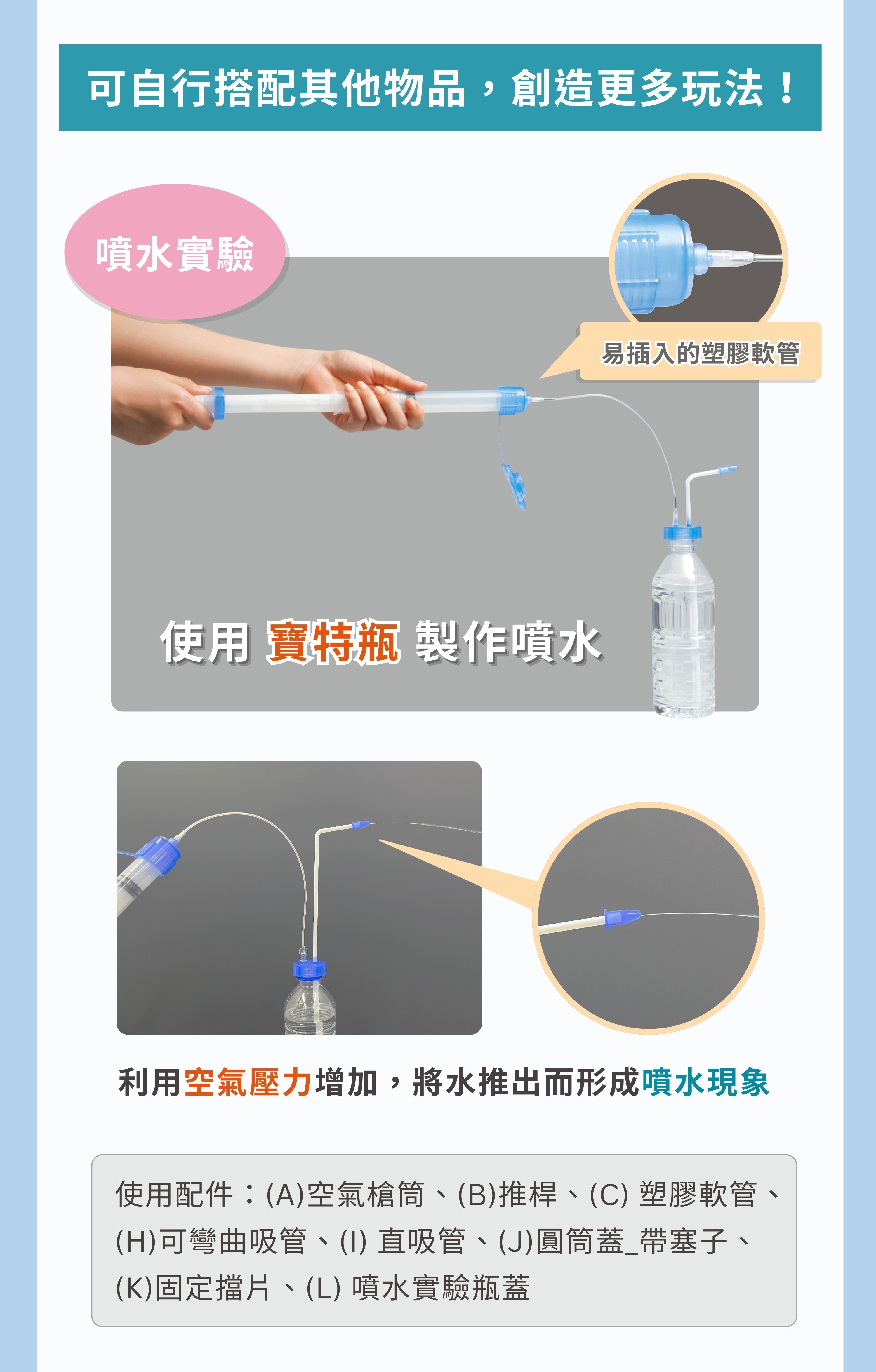 使用配件:(A)空氣槍筒、(B)推桿、(C) 塑膠軟管、(H)可彎曲吸管、(I) 直吸管、(J)圓筒蓋_帶塞子、(K)固定擋片、(L) 噴水實驗瓶蓋