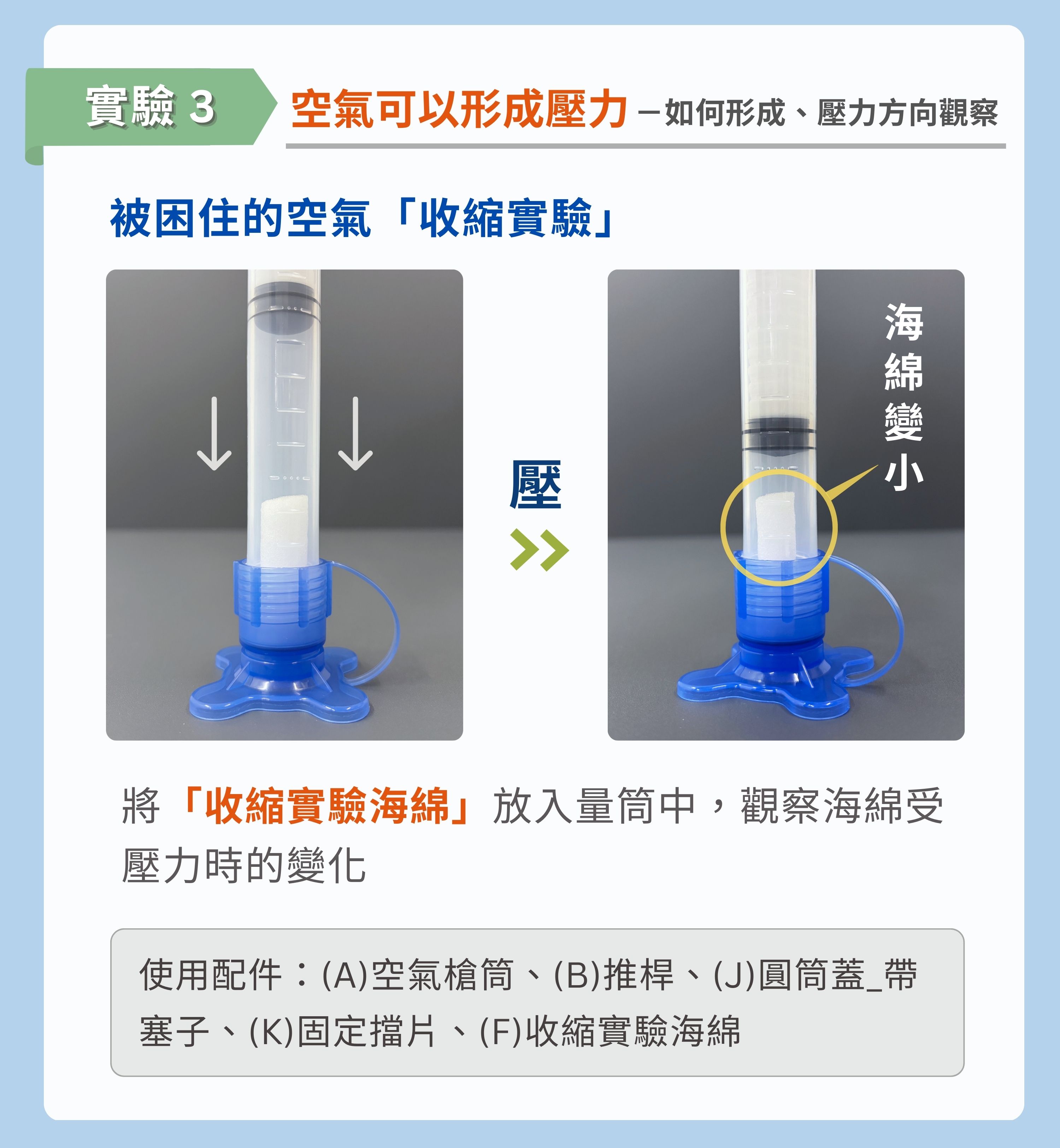被困住的空氣「收縮實驗」→ 將「收縮實驗海綿」放入量筒中,觀察海綿受壓力時的變化。