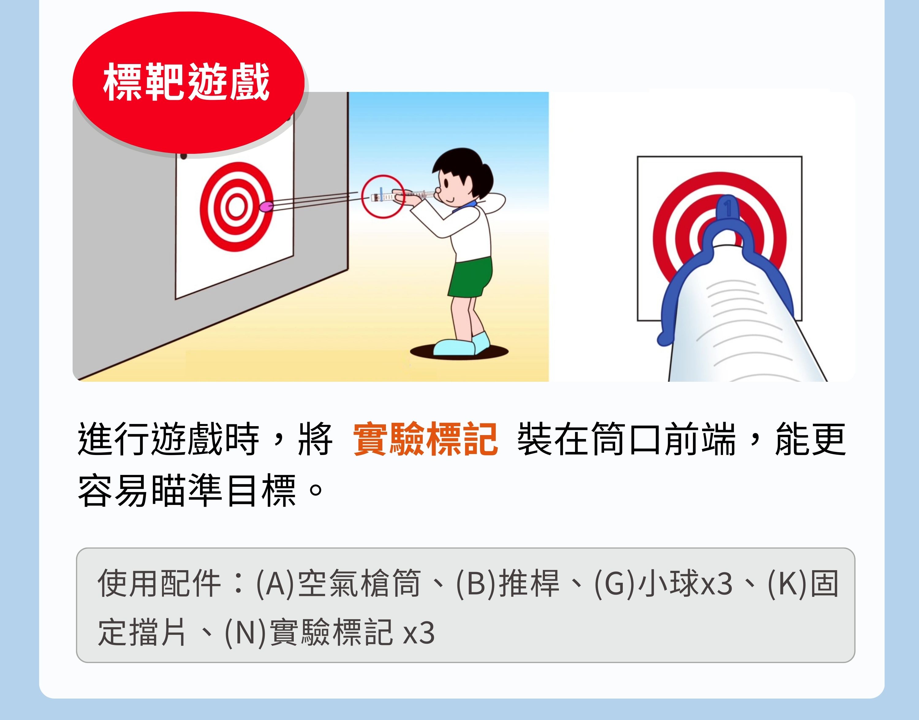 進行遊戲時,將 實驗標記 裝在筒口前端,能更容易瞄準目標。