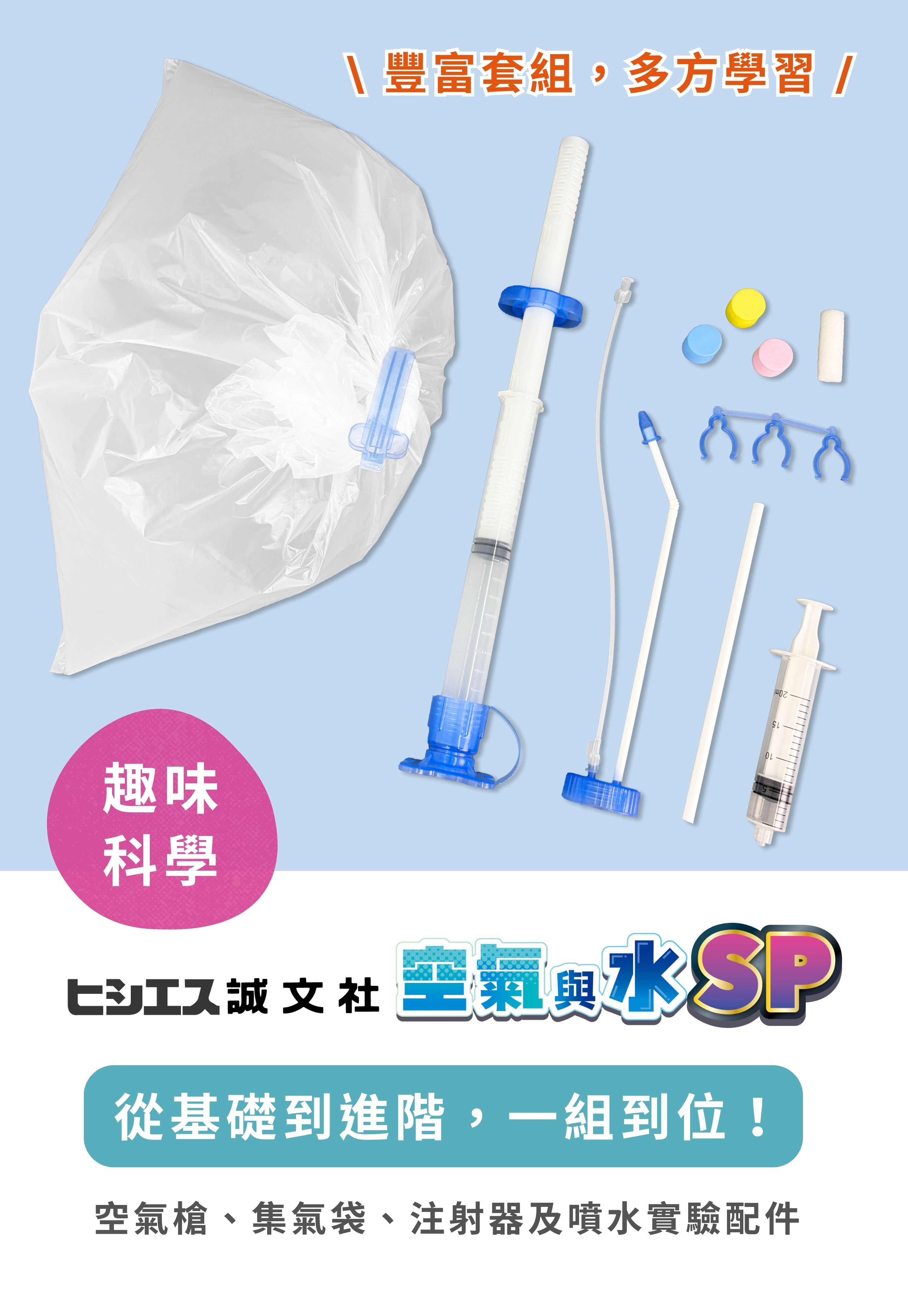 從基礎到進階,一套到位!孩子『看得見、玩得懂』的理科教材,循序探索空氣與水的科學原理,內含空氣槍、集氣袋、注射器及噴水實驗零件的豐富套組。讓 STEAM 教育不只是概念,透過實際操作體驗,感受空氣與水的變化,學習更加生動有趣!
