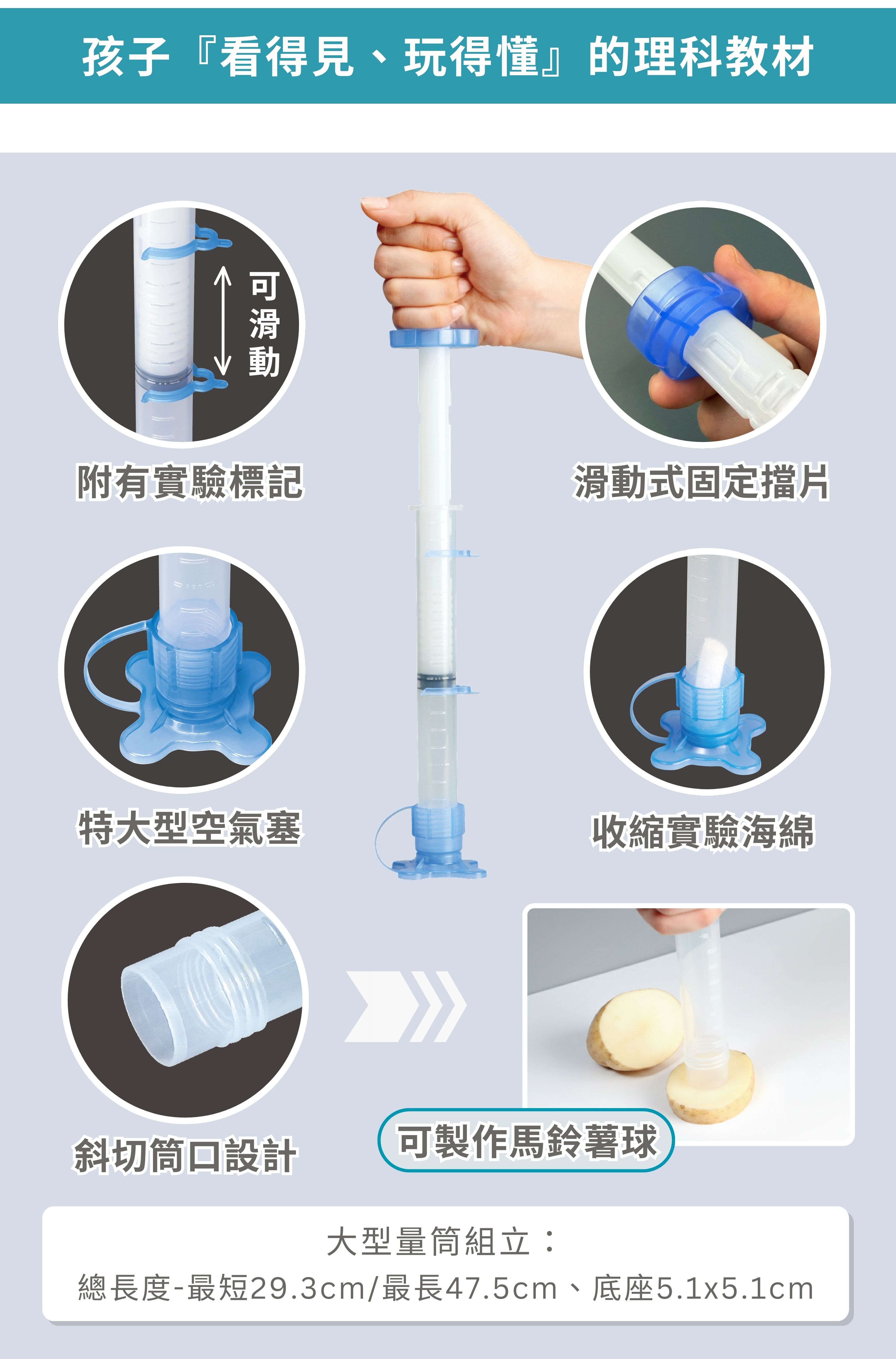 大型量筒組立:總長度-最短29.3cm / 最長47.5cm、底座 5.1 x 5.1cm