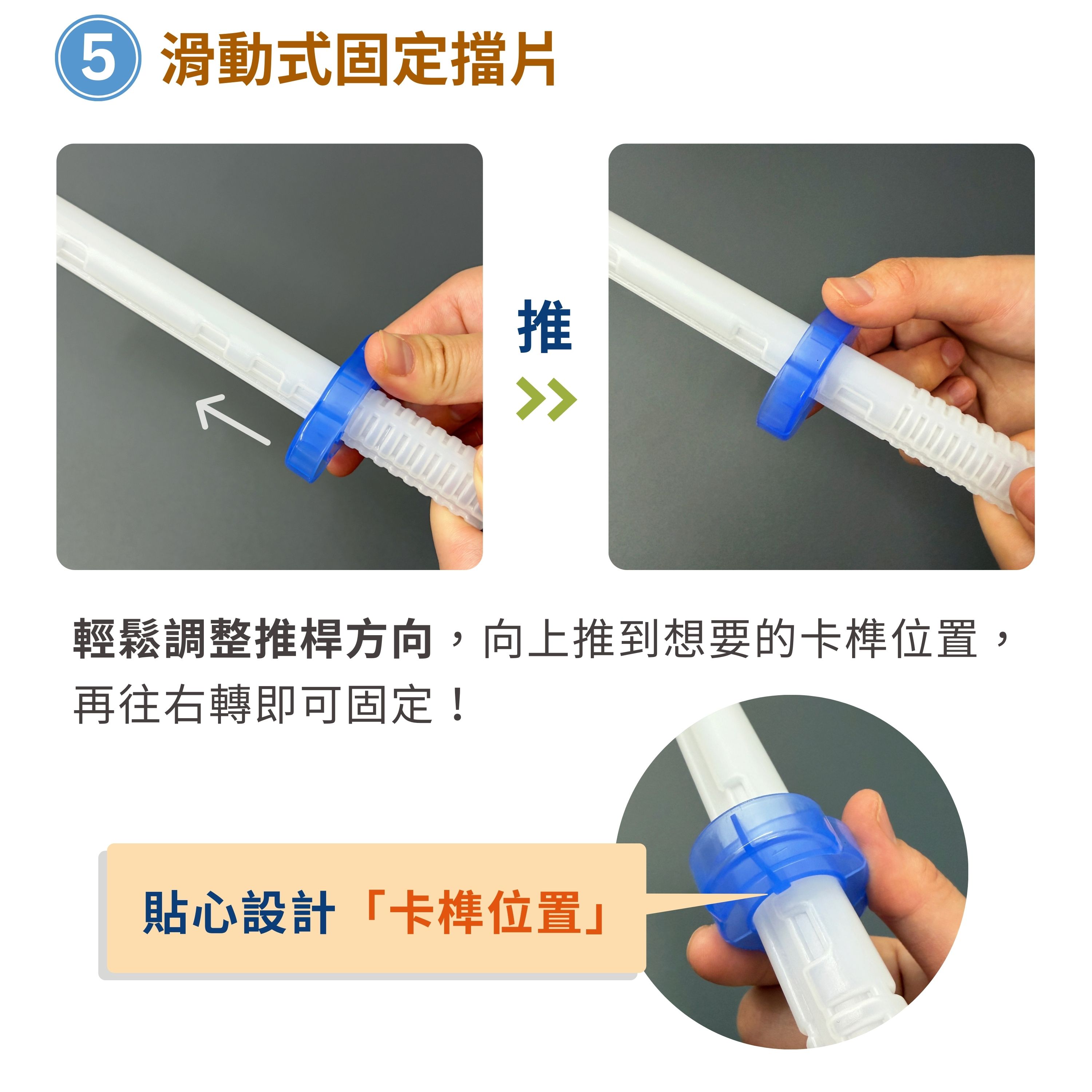 5. 滑動式固定擋片-輕鬆調整推桿方向,貼心設計「卡榫位置」,向上推到想要的卡榫位置,再往右轉即可固定!