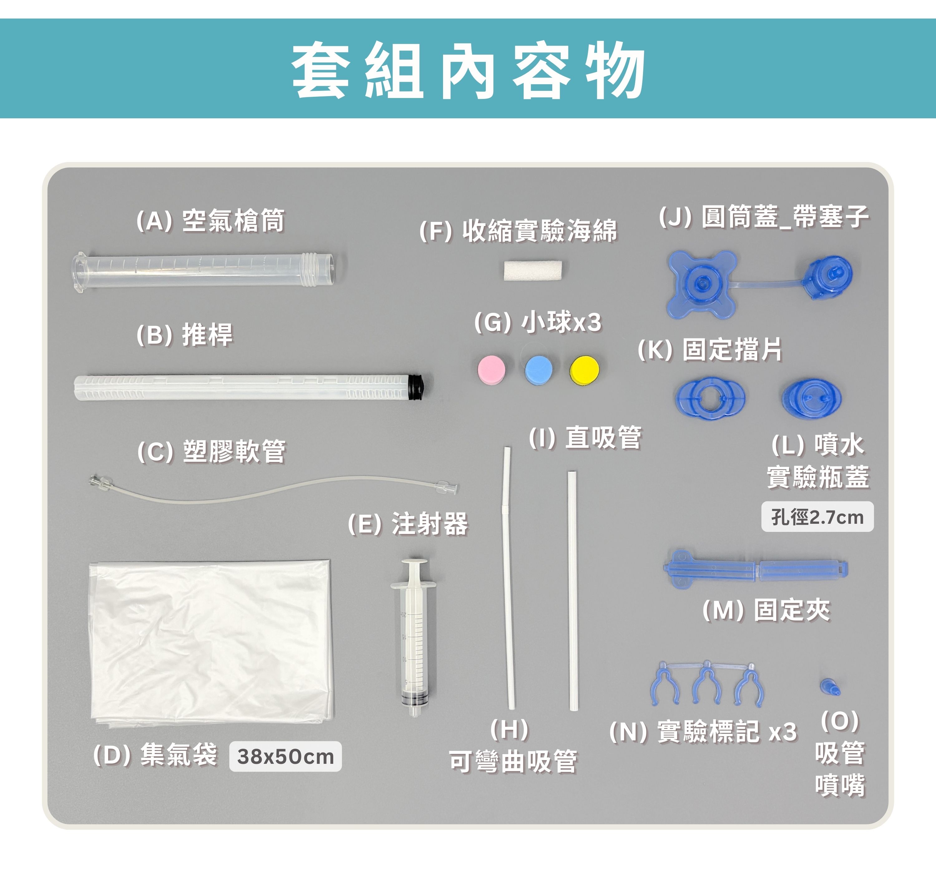 (A)空氣槍筒、(B)推桿、(C)塑膠軟管、(D)集氣袋 (38x50cm)、(E)注射器、(F)收縮實驗海綿、(G)小球x3、(H)可彎曲吸管、(I)直吸管、(J)圓筒蓋_帶塞子、(K)固定擋片、(L)噴水實驗瓶蓋、(M)固定夾、(N)實驗標記x3、(O)吸管噴嘴