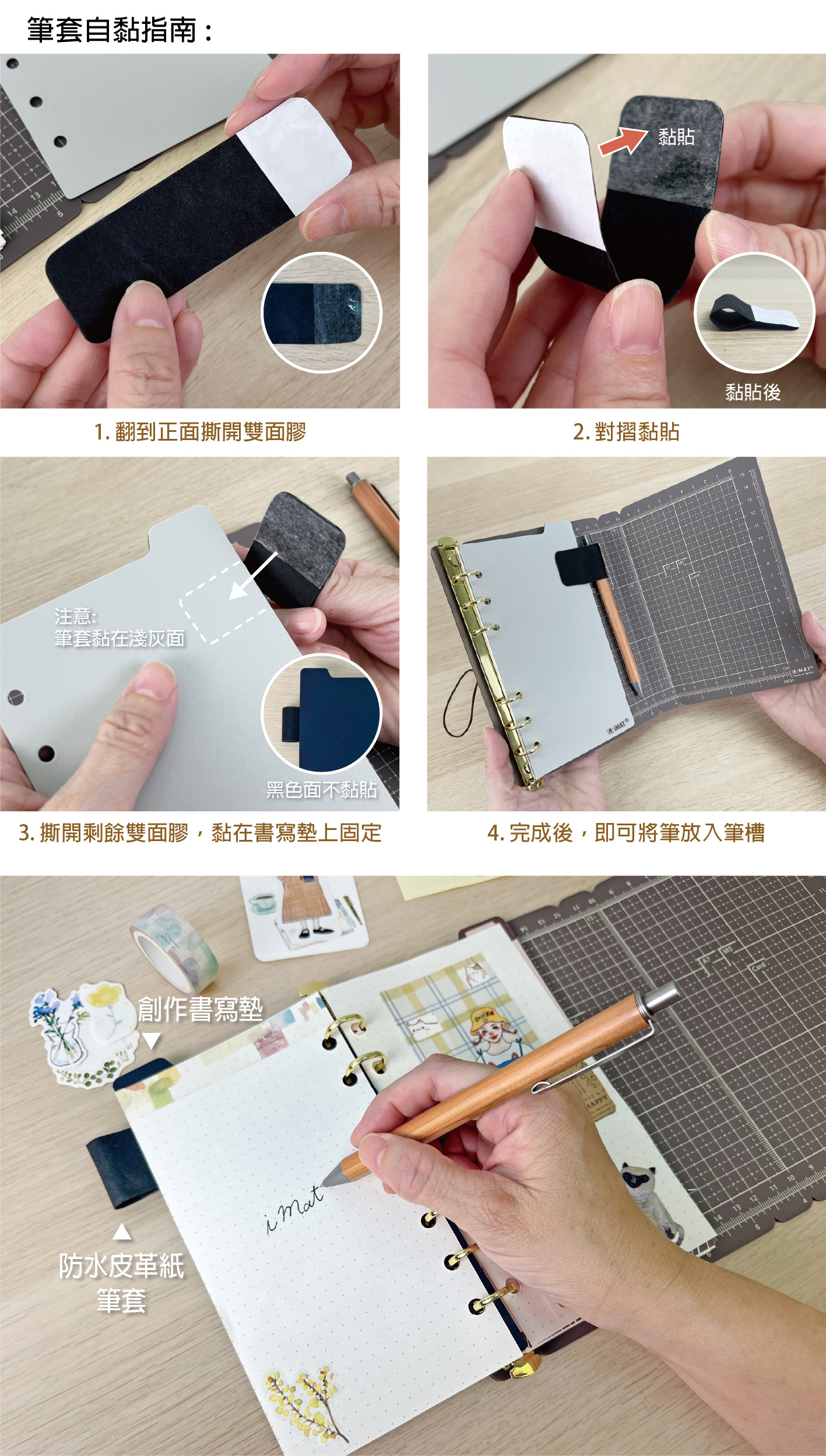 採用德國進口防水皮革紙,自黏設計,輕鬆貼附在書寫墊上,收納筆具不掉落 !