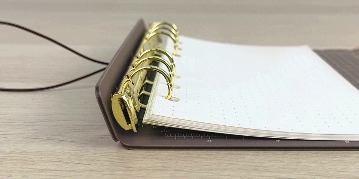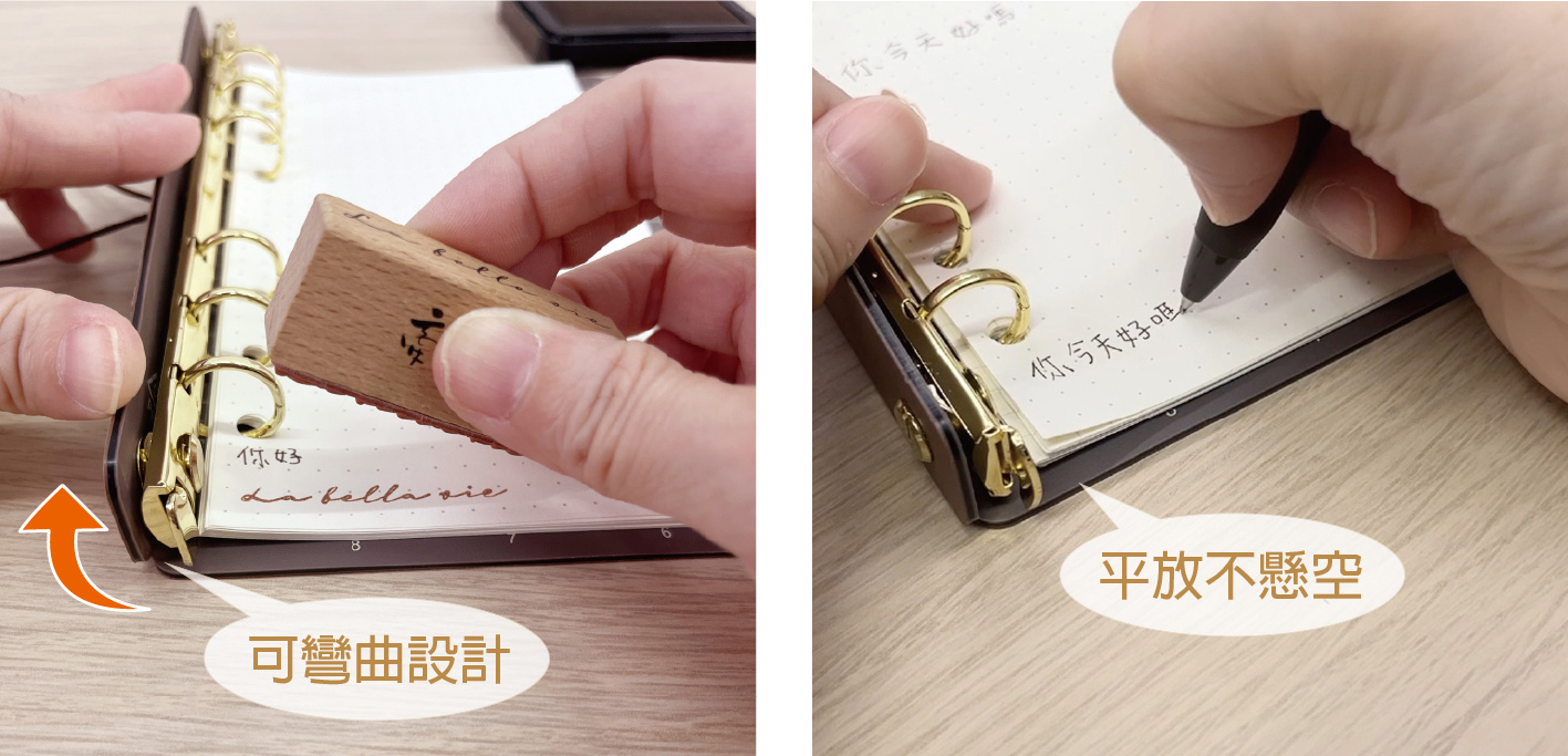 只需推活動式活頁環即可形成 90°,L 型支撐讓內頁紙張平放不懸空,書寫、蓋章更穩定、順手。