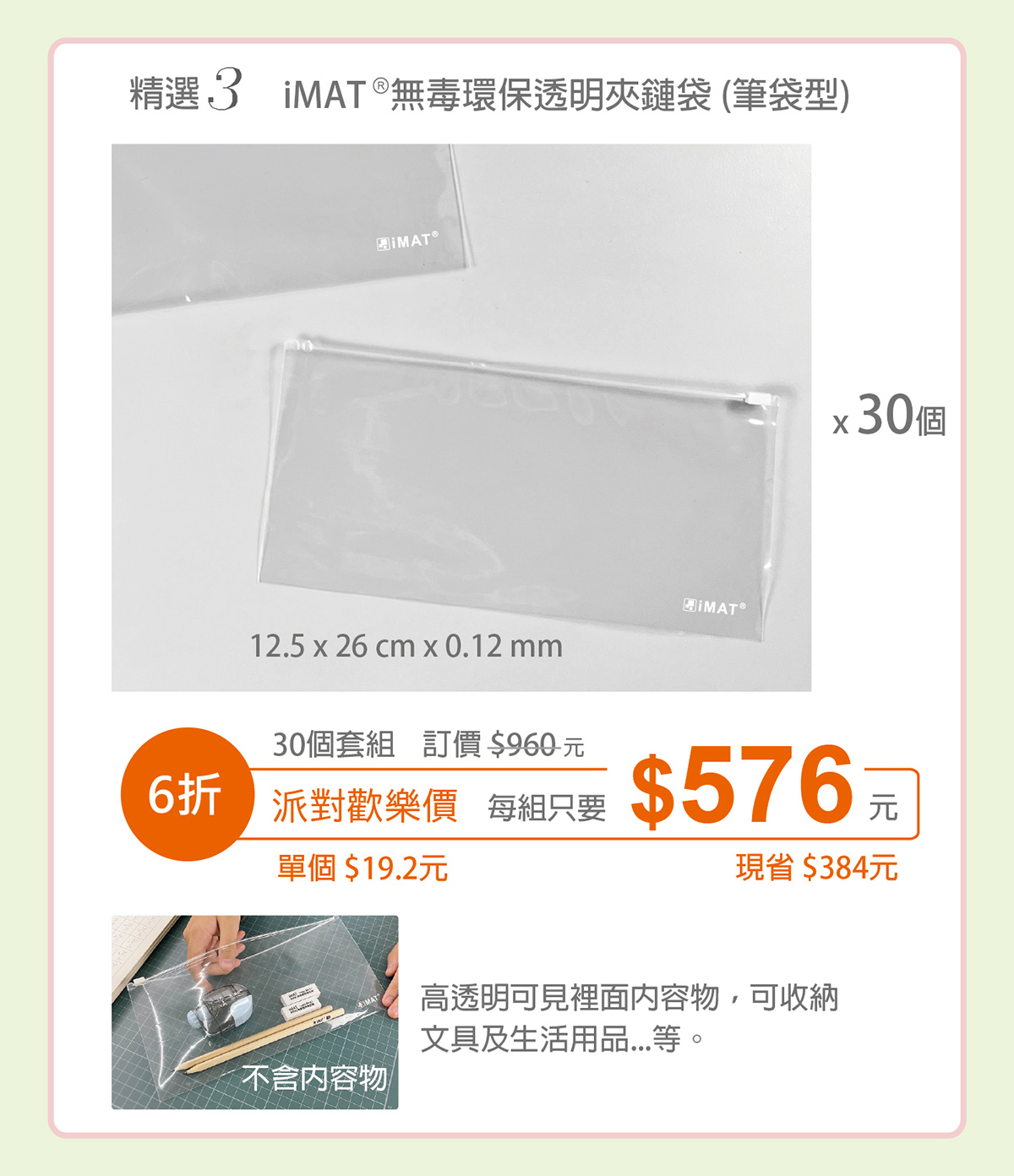精選3-iMAT®無毒環保透明夾鏈袋(筆袋型) x 30個