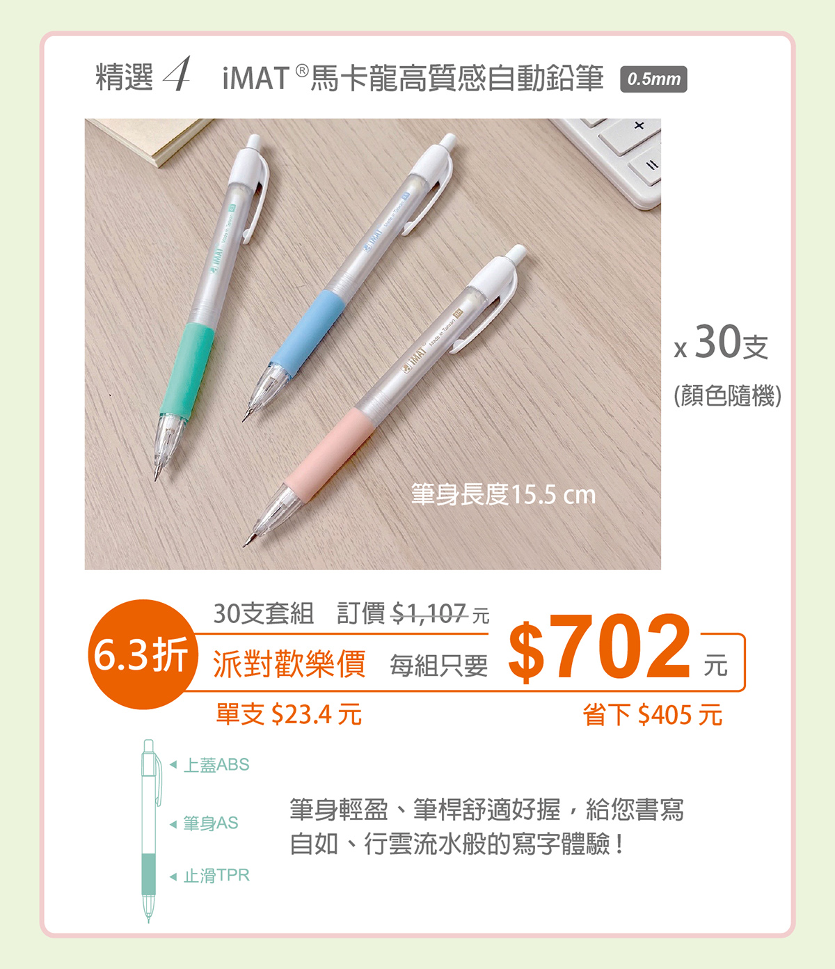 精選4-iMAT®馬卡龍高質感自動鉛筆 (3色隨機) x 30支