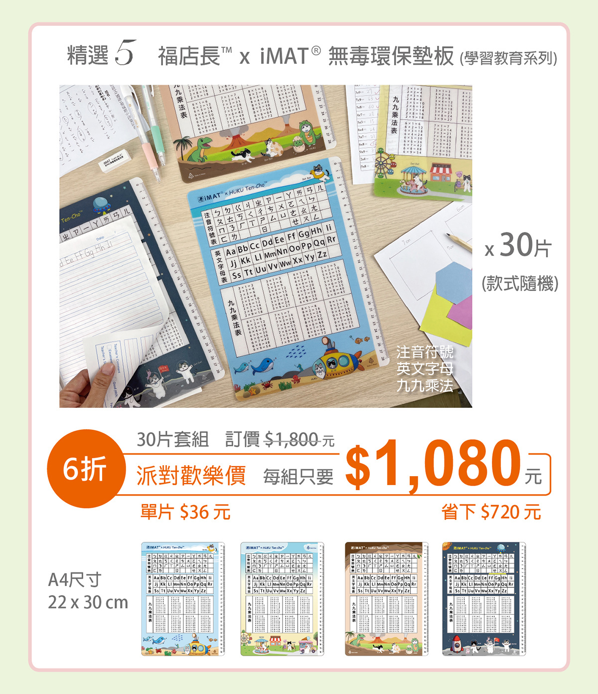 精選5-福店長™ x iMAT®無毒彩色墊板(學習教育系列) x 30片
