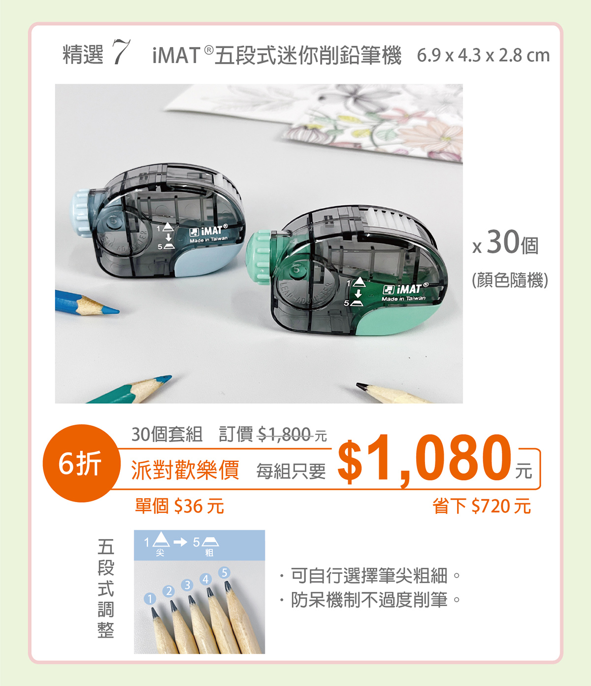 精選7-iMAT®五段式調節削鉛筆機(顏色隨機) x 30個
